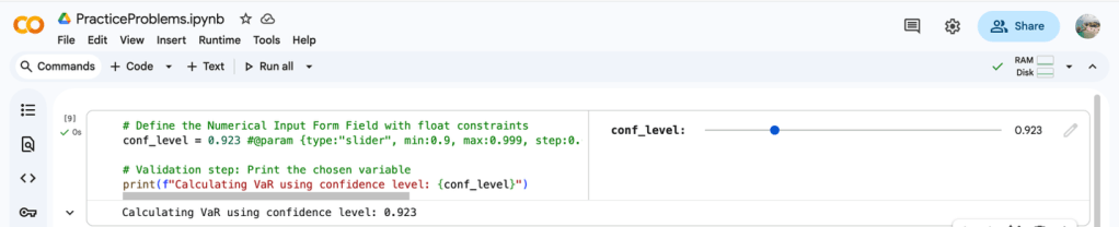 Problem to be Solved: Create a Numerical Slider Form Field labeled “VaR Confidence Level” with a minimum of 0.90, a maximum of 0.999, and a step of 0.001. The value must be assigned to the variable conf_level.