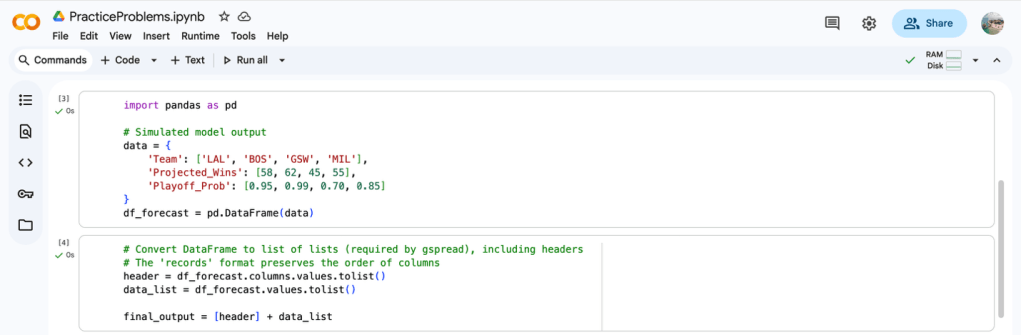 Scenario: A sports analytics consultant working for a professional basketball team has generated the projected win total forecasts for the next season using a complex Colab model. The results need to be shared quickly with the management team, who only use Google Sheets, for the end of the preseason modeling cycle by pushing the data to a Google Sheets spreadsheet named “Season_Forecasts.” To make the results immediately available and interactive for non-technical stakeholders without manual copying and pasting, you must convert the final Pandas DataFrame into a list format and use gspread to write the data to a new sheet named “Model_V2_Results.”