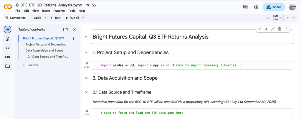 Scenario: You’re an equity researcher at Bright Futures Capital who needs to analyze the quarterly returns of a new Exchange Traded Fund (ETF) and present the initial findings in a notebook structure that is easy for the portfolio manager to review as the first deliverable of a new project in a new Colab environment to establish a clear, documented, and professional workflow for all future financial analysis. You must create a structured notebook using Markdown headings and placeholder code.