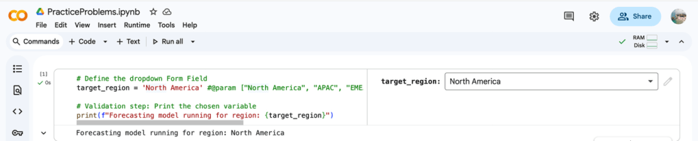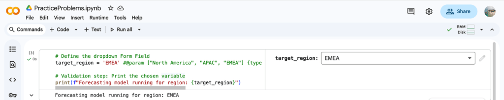 Scenario: The marketing strategy team uses a predictive model to allocate next quarter’s budget across three global regions: North America, APAC, and EMEA. The marketing manager, who is not a coder, must select the target region to generate the forecast report. To ensure correct, standardized input for the forecast without requiring code modification, the marketing strategy team must use a Colab Form Field dropdown.