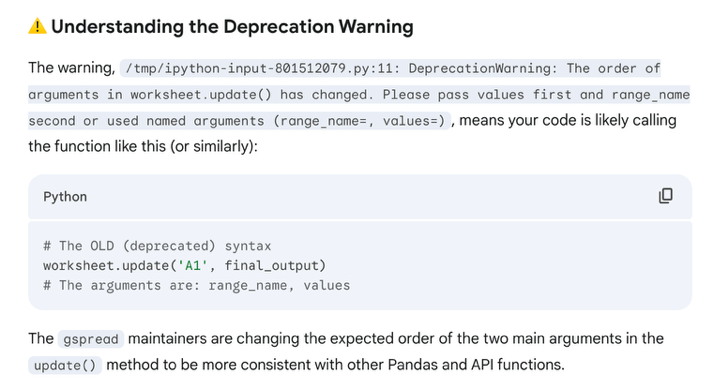 Completed writing data to new sheet. Deprecation warning noted.
